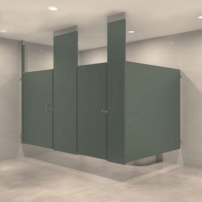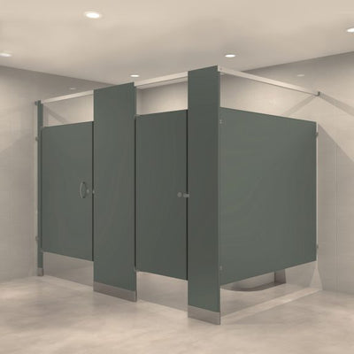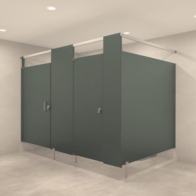 Ceiling-hung, powder coated toilet partitions provide a clean look and are recommended for modernization where a drop ceiling or open-pan construction can be used. Ceiling-hung installation connects partitions to the ceiling and do not have a floor base; floor-to-ceiling pilasters may be required for some layout conditions.