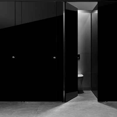 A floating wall of cubicles. Simply beautiful. Comprising of a stepped back stainless steel foot, fully engineered integral lock and concealed hydraulic door closer.